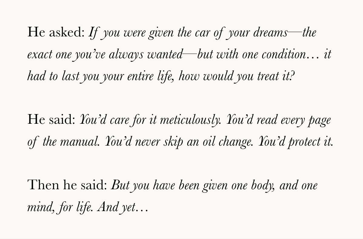 We have this one vessel. This one life. And yet, how easily we forget. We treat our energy like it’s renewable, our time like it’s infinite, our health like it’s a given.